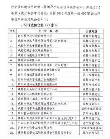 721日,四川省環境保護廳發布2017年第1號公告,公布了2016年度第一批企業環境信用評價結果。在全省申報的851家企業中,包括四川東材科技集團股份有限公司在內的29家企業獲得四川省2016年度“環境誠信企業”稱號。